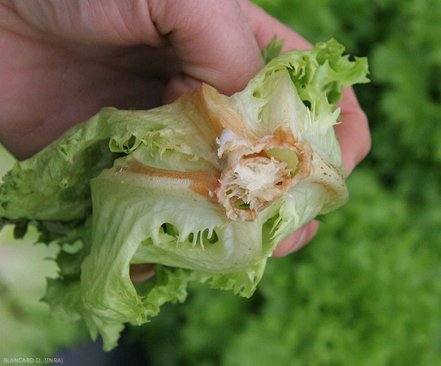 Ils sont responsables d'altérations humides et de couleur marron clair affectant les parties des plantes au contact du sol et notamment les feuilles sénescentes, puis le collet (figures 1 et 2). Ces altérations évoluent très vite en une pourriture qui se généralise aux strates de feuilles proches du sol (figures 3 et 4). Les pétioles et les nervures principales ainsi que le collet (figure 5) sont envahis, ce qui conduit à la chlorose et au flétrissement des feuilles externes (figures 6 à 8), puis des plantes, parfois en moins de 2 jours. Par la suite, la pourriture gagne l'ensemble des tissus foliaires qui se décomposent et s'effondrent (figures 9 et 10). L'arrachage de ces plantes n'offre aucune résistance.