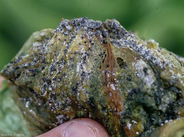Des taches dans un premier temps, puis des altérations comparables à celles décrites précédemment, peuvent s'initier plus en hauteur, à partir de feuilles exposées aux ascospores de Sclerotinia sclerotiorum. L'extension des taches est rapide et conduit inévitablement à la pourriture de plusieurs feuilles et de la pomme (figure 11).