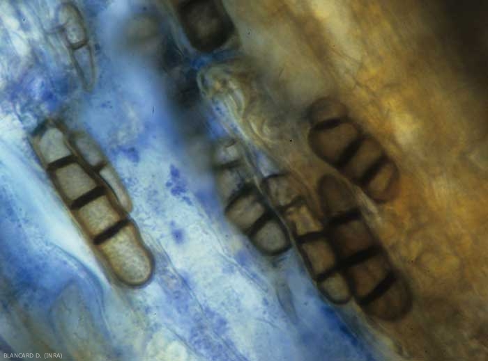 Ce champignon étant mal connu sur salades, l'hypothèse de son intervention sur ces plantes n'est jamais émise et donc en aucun cas retenue. Seules des observations microscopiques de fragments de racines altérées permettent d'observer les chlamydospores typiques de Thielaviopsis basicola sur et dans les cellules du cortex (figure 6).