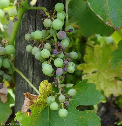 Les baies de raisin sont sensibles au mildiou jusqu'à la véraison. Elles peuvent être atteinte parfois très précocement, après la nouaison, sur des fruits de quelques mm de diamètre issus d'inflorescences déjà attaquées. Là encore, de nombreux sporangiophores et des sporanges peuvent se former. Les baies affectées moins précocement présentent des taches violacées à noirâtres, déprimées (« en coup de pouce »), non fructifères. Dans ce cas, on est en présence du « rot brun » (figures 15 à 20).