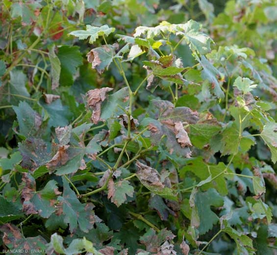 - des taches plus ou moins circulaires et étendues, d'abord translucides à huileuses, jaunissant assez rapidement, puis se nécrosant (plutôt sur jeunes feuilles)(figures 1 à 3). Un duvet blanc plus ou moins dense se forme à la face inférieure de ces taches (figures 4 et 5) ; il est constitué par les sporangiophores et les sporanges de P. viticola. Mesurant jusqu'à 1 cm et parfois confluentes, ces taches peuvent couvrir la quasi-totalité du limbe et entraîner le dessèchement des feuilles et leur chute, les ceps devenant fortement effeuillés (figure 10) ;