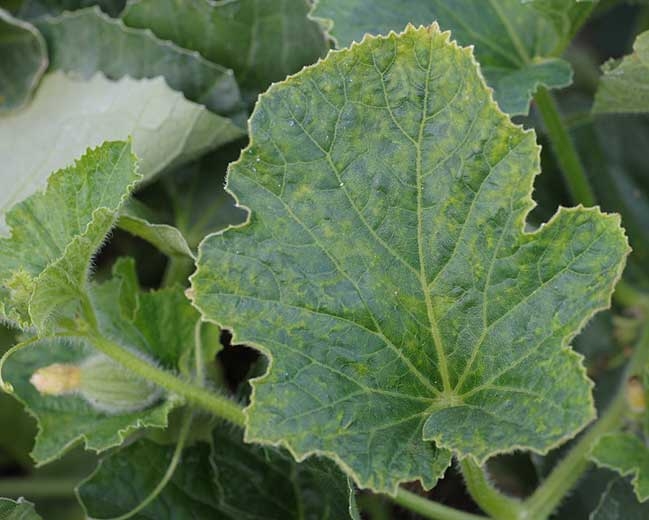 Chez la courgette : Les symptômes commencent par des taches chlorotiques sur les feuilles inoculées. Au fur et à mesure que la mosaïque se développe, les feuilles se recroquevillent sur elles-mêmes, se déforment, la plante se bloque et prend un aspect jaunissant. Les premiers fruits produits présentent des petites dépressions en "piqûre d'épingles" plus ou moins prononcées, puis toutes les fleurs coulent et la fructification s'arrête. Chez la courgette, le CMV est plus fréquent en période fraîche (printemps, automne). Par ailleurs, on note une plus grande sensibilité des jeunes plantes (on parle de résistance ou de moindre sensibilité au stade "adulte").