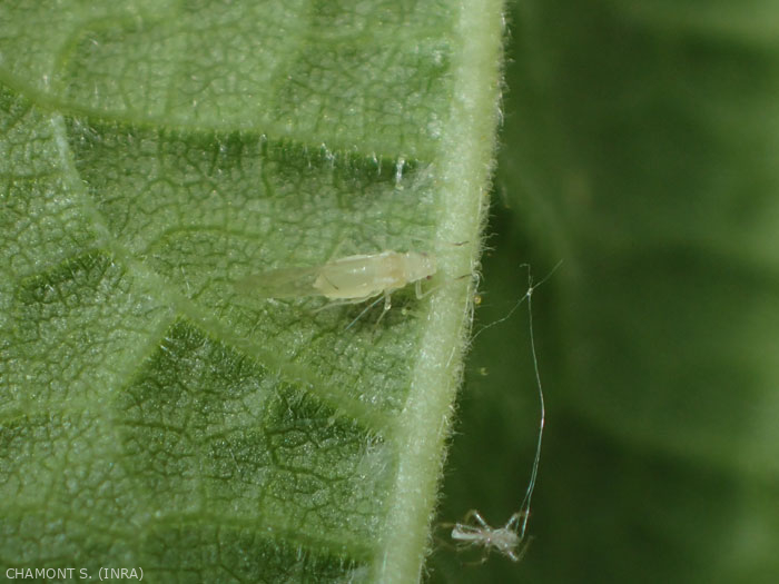 <em>Myzocallis coryli</em> vit à la surface inférieure des jeunes feuilles de noisetier. <strong>Puceron jaune du noisetier</strong> (hazel aphid)