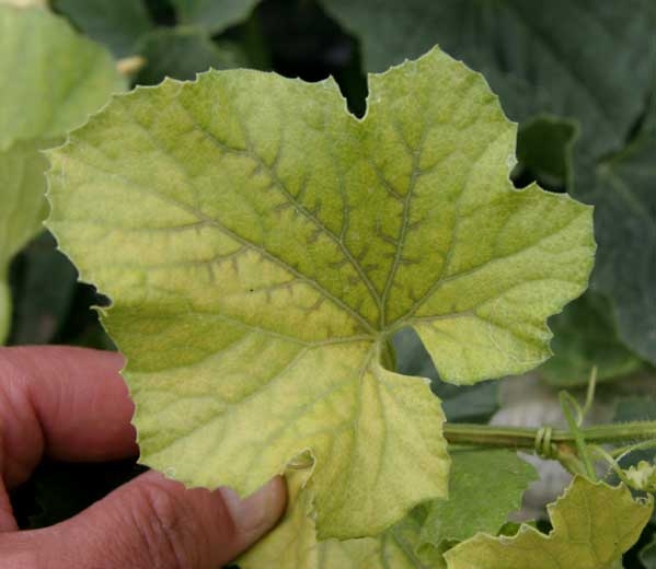 Le limbe de cette feuille de melon observée sur une plante fusariée est décoloré de façon homogène, les nervures sont également plus claires. <b><i>Fusarium oxysporum</i> f. sp. <i>melonis</i></b> (fusariose)