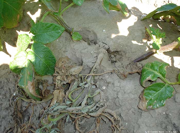 Les altérations à la base des tiges ou dans le sol peuvent correspondre à des nécroses, des pourriture ou des déformations de tiges ou à des tiges rongées.