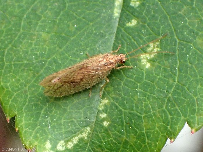 Gli adulti di Hemerobidae sono di colore marrone, con ali spesso ornate di macchie più scure. La loro apertura alare è di circa 15 mm (figura 7). Le uova sono biancastre ma prive di peduncolo e fissate singolarmente o in piccoli gruppi.