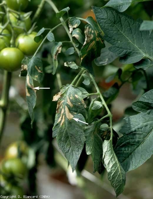 En plein champ, les symptômes foliaires sont un peu différents : les flétrissements et dessèchements se mettent en place en bordure du limbe. Des lésions brunes, en forme de « V » inversé et souvent auréolées d'un halo jaune plus ou moins large, peuvent être constatées sur certaines folioles. Elles évoluent et gagnent l'ensemble du limbe, qui finit par se dessécher entièrement. De nombreuses feuilles sont affectées et les plantes peuvent, à terme, mourir.