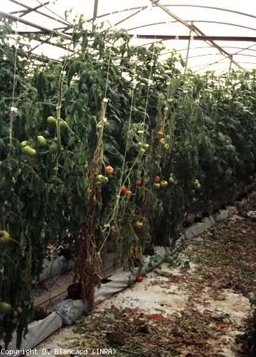 Que la culture de tomate soit produite sous serre ou en plein champ, la répartition des plantes malades est fréquemment la même : en lignes plus ou moins longues (figure 3). Cette répartition très caractéristique est liée au mode de transmission de C. michiganensis subsp. michiganensis qui s'effectue de plante à plante au cours des opérations culturales, et en particulier durant la taille des bourgeons axillaires.