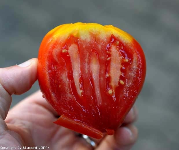 Placées dans ces conditions, les différentes variétés de tomate cultivées n'expriment pas la même sensibilité. À titre d'exemple, les cultivars à fruits « uniform color » sont résistants. D'autre part, ceux de type « longue conservation » manifestent assez facilement ce défaut.