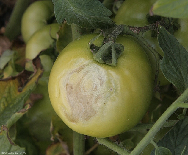 Sui verdi o rotanti scottature ( frutti scottatura , le , solari scottatura solare ) provocano macchie che talvolta compaiono sul lato più esposto alla luce solare diretta, durante periodi climatici molto caldi. Queste lesioni sono irregolari, biancastre al centro e più o meno circondate da un alone giallo (figure da 1 a 4). Sono leggermente depresse, la loro superficie è più o meno rugosa e assume una consistenza secca che ricorda la carta. Spesso superficiali, sono talvolta invase da vari funghi opportunisti, in particolare Alternaria alternata . In questo caso, una muffa dal marrone al nero li copre gradualmente.