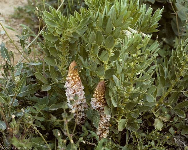 L'apparition de touffes colorées de blanc, de jaune ou de violet au pied des plantes caractérise le parasitisme des orobanches (figures 1 et 2). Ces touffes correspondent aux hampes florales qui peuvent avoir une hauteur d'une à plusieurs dizaines de centimètres. Ces hampes portent des fleurs bleu pâle à bleu violacé dans le cas d'O. ramosa, qui produiront des capsules contenant 300 à 500 graines chacune (graines mesurant de 0,2 à 0,4 mm de long).