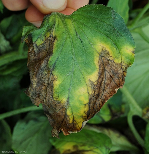 Le piante colpite da Verticillium dahliae mostrano frequentemente un discreto avvizzimento delle foglioline inferiori nelle ore più calde della giornata. All'inizio, questo avvizzimento è reversibile durante la notte. Successivamente, con l'evolversi della malattia, si può osservare che alcuni settori della lamina fogliare, spesso internervali e a forma di “V”, si addolciscono e ingialliscono gradualmente (figure da 1 a 3). Ampie porzioni delle foglioline alla fine diventano dal beige al marrone e poi necrose (Figure da 3 a 8). Volantini e foglie così colpite muoiono prematuramente, il che può portare all'esposizione dei frutti alla radiazione solare e quindi al rischio di ustioni solari .