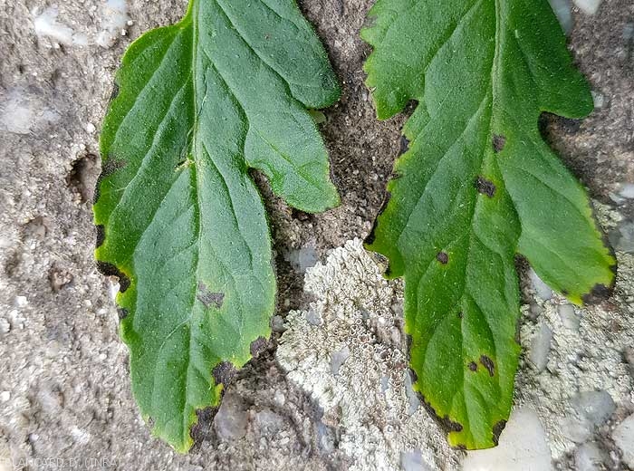 I sintomi sui lembi di questa batteriosi aerea sono abbastanza paragonabili a quelli descritti per Xanthomonas spp. : piccole macchie untuose , scure, che assumono rapidamente una sfumatura dal marrone al nero , compaiono casualmente sulle foglioline, spesso le più giovani o al margine del lembo fogliare (figura 1). Queste lesioni sono circolari o leggermente angolose e presentano un alone giallo più o meno ampio e marcato (figura 2). Con un diametro dell'ordine di 2 o 3 mm, possono diffondersi e fondersi in presenza di umidità, alterando ampi settori della lamina che alla fine si necrotizzano e si seccano . Le foglie fortemente colpite possono ingiallire e seccare completamente.