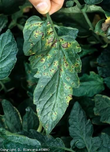 Solo i sintomi sui frutti consentono di differenziare la macchiolina dalla crosta batterica: Pseudomonas syringae pv. il pomodoro è all'origine di minuscole macchie nere , per lo più sui frutti verdi (figure da 5 a 7). Questi sono molto superficiali, leggermente rialzati e hanno un diametro dell'ordine del millimetro (meno di 3 mm al massimo). A volte li circonda un alone umido e verde scuro. Queste macchie nere persistono sui frutti rossi maturi.