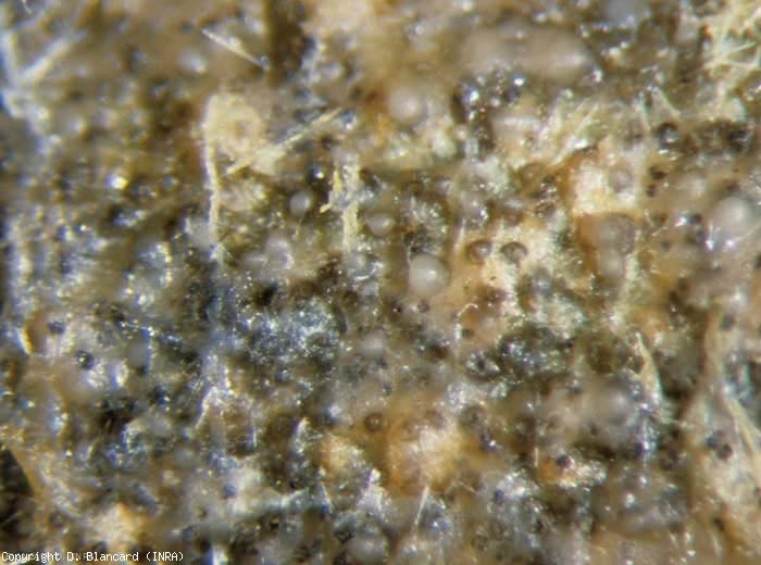 Su tutti gli organi colpiti, minuscole strutture globulari (distinguibili ad occhio nudo ma più facilmente con una lente d'ingrandimento) (figura 8) e più o meno bruno-nero punteggiano i tessuti alterati. Sono molto numerosi sui frutti, più radi sui fusti, rari sulle foglioline.