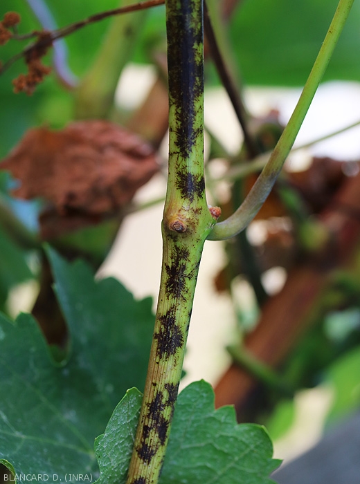 Anche i giovani ramoscelli sono colonizzati da E. necator . Ricoperte dal suo micelio, presentano macchie, anche irregolari e zone poco definite più o meno polverose. L'indurimento dei rametti oidizzati è spesso parziale e in autunno le zone colpite da E. necator assumono una colorazione da brunastra a nerastra sempre visibile durante l'inverno (Figure 7 e 8).