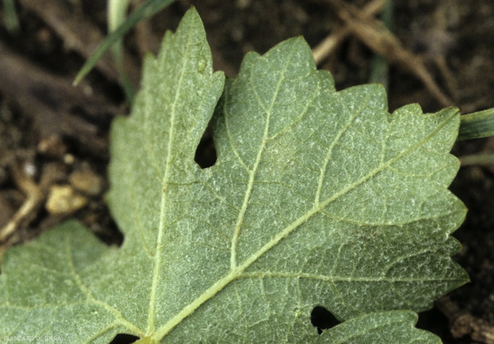 - piccole macchie sparse, leggermente clorotiche, lanuginose che si sviluppano nella pagina inferiore (figura 1), poi nella pagina superiore delle foglie (figura 2). Queste macchie, spesso conseguenti a contaminazioni primarie da ascospore, si diffondono e diventano sempre più polverose (figura 3). Ci sono isole di cellule marroni necrotiche. La chioma fortemente attaccata presenta foglie più o meno deformate (figure 4 e 5) e assume una tinta grigiastra, dando l'impressione di essere ricoperto da polvere di terra;