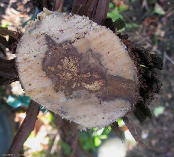 Una sezione trasversale delle viti che mostrano sintomi fogliari di esca mostra varie lesioni necrotiche nel legno :