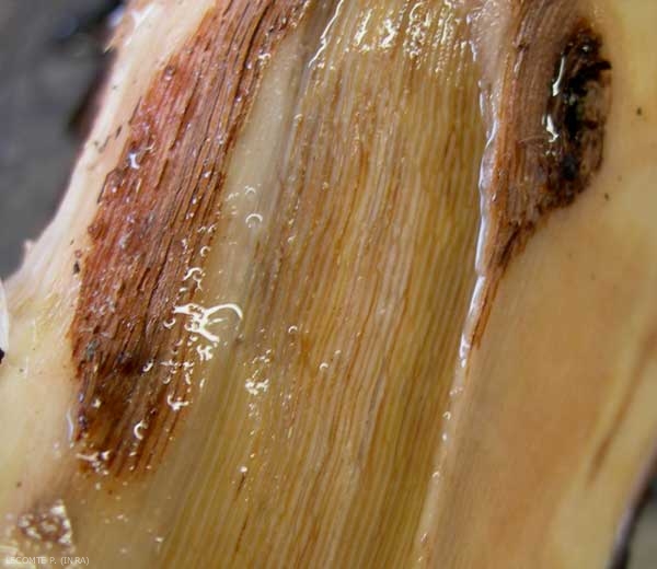 ** I due funghi pionieri, Phaeomoniella chlamydospora e e Phaeoacremonium aleophilum delle punture nere , sono entrambi responsabili della necrosi bruna centrale o settoriale visibili nelle viti. Aggiungiamo che dalla necrosi settoriale vengono spesso isolati altri funghi: diverse specie di Botryosphaeria , e talvolta Eutypa lata che è responsabile dell'eutypia.