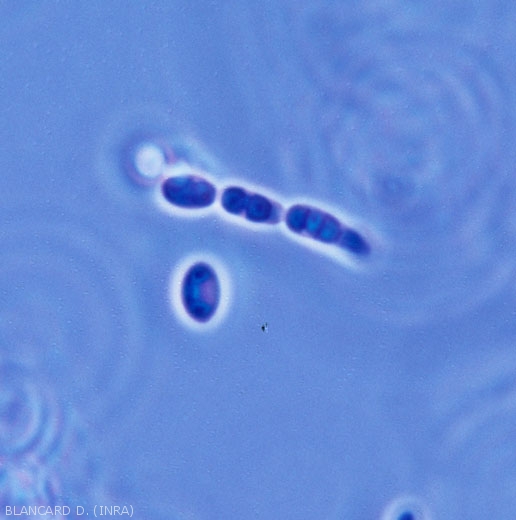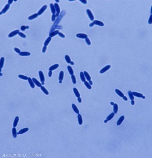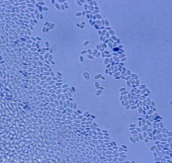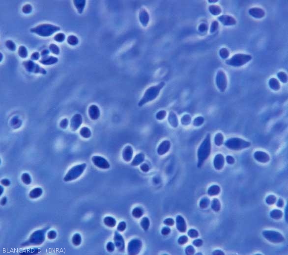 • Kloeckera apiculata : cellule isolate, in coppia o occasionalmente in gruppi di 3-4 cellule (Figura 1). La loro forma ellissoidale e appuntita alle estremità conferisce loro l'aspetto di un limone le cui dimensioni sono dell'ordine di 1,4-5,3 x 2,6-12,2 µm. La formazione di una nuova cellula viene effettuata dai poli. Le cellule ovali di Hanseniaspora uvarum hanno un'estremità appuntita. Isolati o in coppia, si moltiplicano per gemmazione bipolare (Figura 2).