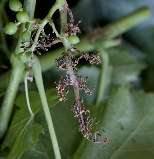 Sintomi : durante l'invaiatura compaiono lesioni necrotiche marrone scuro sul fusto, spesso ben delimitate ai rami. Il raspo e gli acini alla fine appassiscono e si seccano.