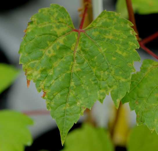 - anomalia di colorazione con diversa intensità e distribuzione sulle foglie - a macchie, in zone intravenose più o meno ben delimitate (simazina), talvolta evolvente in necrosi tissutale, interessando le nervature (diuron) - (figure da 5 a 7) o sviluppando tra di loro, generalizzando alla lamina, toccando le foglie all'apice o più in basso sui germogli??.