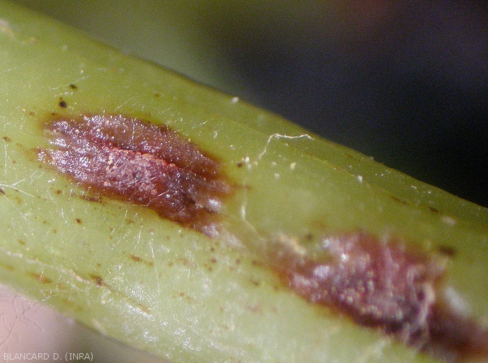 - una forma asessuale o anamorfica ( Sphaceloma ampelinum ) che causa acervuli superficiali o sottocuticolari sulle foglie. Su questi acervuli, come sugli stromi, sono costituiti da numerosi conidiofori che formano conidi ialini ed ellissoidi di dimensioni 3-7,5 x 2-8 µm.