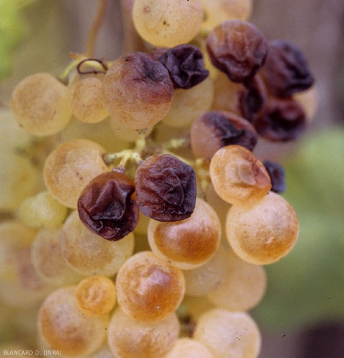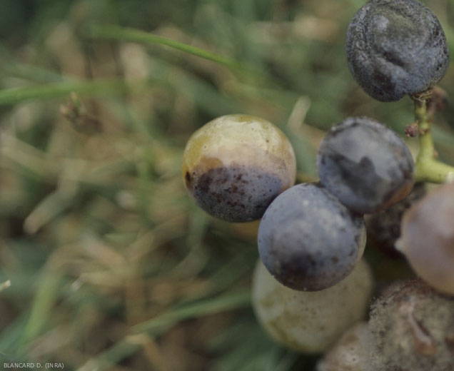 Sugli acini d'uva invasi da Alternaria spp. . Queste alterazioni sono spesso avviate nella zona pedicellare degli acini, sono di colore da rossastro a marrone chiaro all'inizio dello sviluppo (a seconda del vitigno) e successivamente si scuriscono gradualmente (figure da 1 a 3).