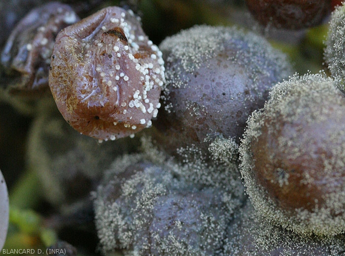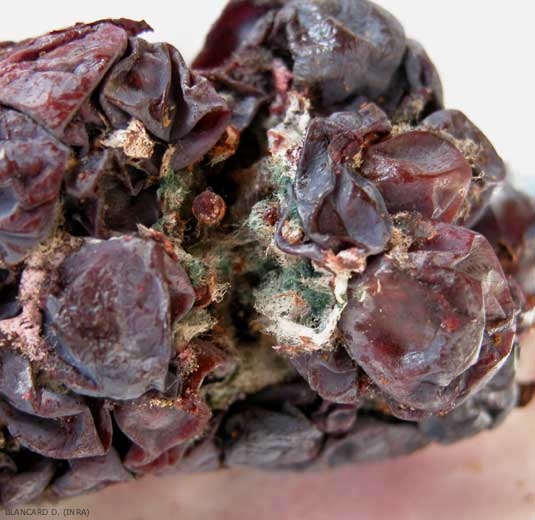 Penicillium expansum Principalmente e poche altre specie di Penicillium spp. sono responsabili di un marciume morbido e umido sugli acini d'uva, il cui colore è leggermente blu scuro sui vitigni neri (figura 1) e da beige a rossastro sui vitigni bianchi (figure 2 e 3). Va notato che i tessuti marci si ricoprono gradualmente di cuscinetti sporigeni, il cui colore varia nel tempo (figure 4 e 5). Prima biancastre, diventano blu ( marciume blu, muffa blu) o anche gradualmente verdi e si scuriscono.