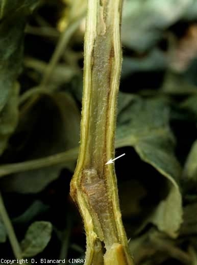 Brunimento longitudinale sulla colonna vertebrale di una foglia di pomodoro. <i><b>Pseudomonas corrugata</b></i> (mozzo nero, tomato pith necrosis)