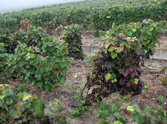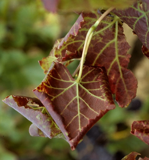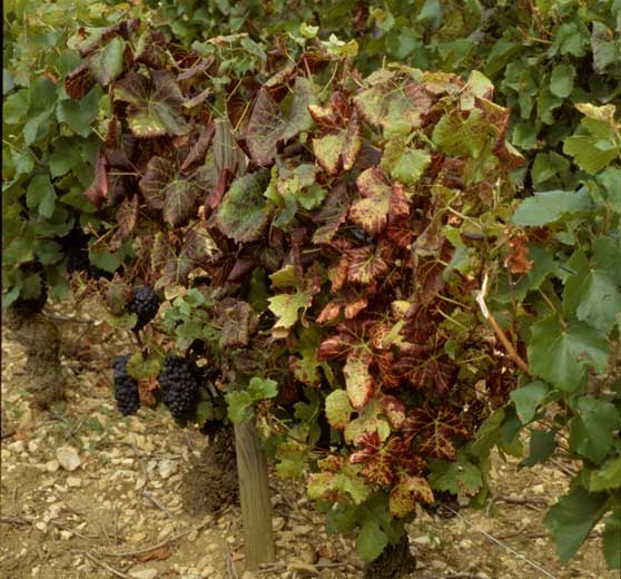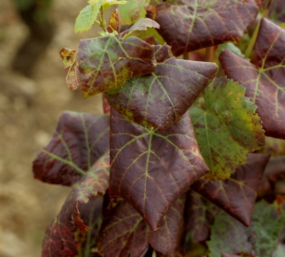 - Sui vitigni a bacca rossa, le foglie poste sulla parte inferiore dei rametti diventano rosse in macchie più o meno grandi a causa dell'accumulo di antociani, mentre le nervature principali rimangono verdi (figure da 1 a 4) e il lembo si ispessisce. L'arrossamento diventa progressivamente generale nel limbus (Figure da 7 a 14). Nota che alla fine della stagione le foglie colpite diventano marroni e muoiono.
