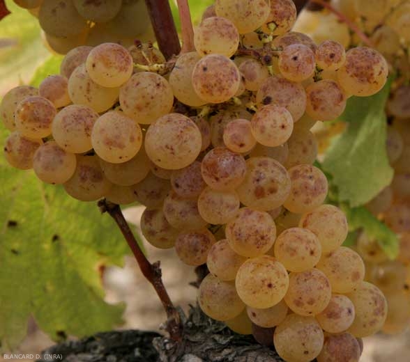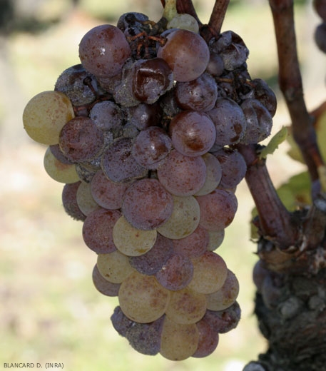 Prima di questo processo di botritizzazione , gli acini dell'uva sono dorati, con buccia spessa, leggermente pigmentata di marrone. Sotto l'azione della Botrytis , assumono quindi una tonalità marrone cioccolato, quindi diventano viola o addirittura blu notte prima di appassire. Diciamo allora che l'uva è "arrostita". Queste trasformazioni sono dovute ad una significativa perdita di acqua, ma anche ad un'intensa macerazione enzimatica della loro buccia. A titolo di esempio, ricordiamo che l'attività pectinasica osservata in una bacca marcia è circa cento volte maggiore di quella misurata in una bacca sana.