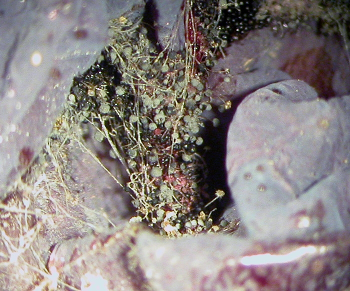 • Il micelio di Rhizopus stolonifer è costituito in gran parte da ife sifonizzate che crescono rapidamente. È da queste ife brune che si sviluppano i corridori , caratteristiche ife ricurve, all'origine del nome specifico di questo Rhizopus . Quando i corridori entrano in contatto con il substrato del fungo (qui: il grappolo), producono quindi rizoidi ramificati (figure 1 e 2) da cui partiranno gli sporangiofori in direzione opposta (figure da 3 a 7).
