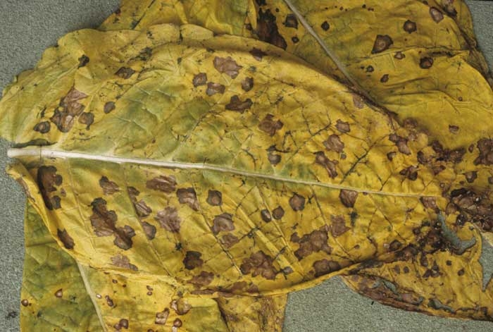 Alternaria alternata é frequentemente observada. Este frágil fungo também ocorre na lavoura, e pode  facilmante desenvolver-se em folhas maduras de tabaco (figura 5);