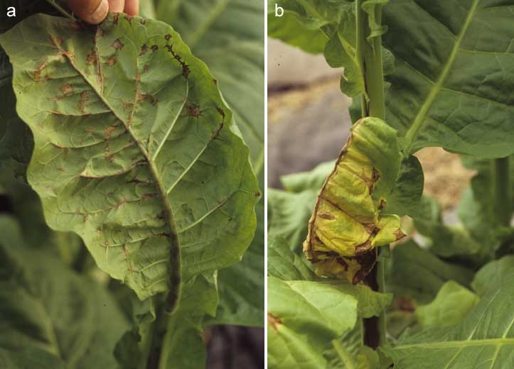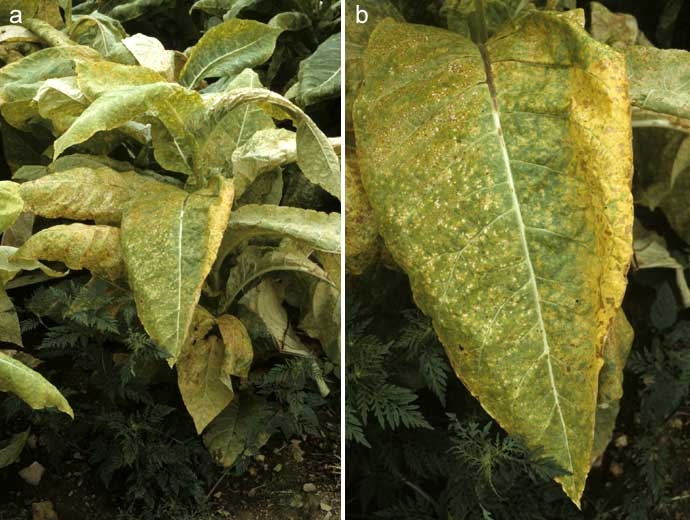 - O Tabacco Etch Virus (TEV) é um potyvírus como o PVY. Um "clareamento da nervura" e mosqueamento é observada em folhas jovens, arabescos necrosados, manchas intervervais cloróticas tornan-se necrosadas, e sintomas de necrose na nervura de folhas inferiores também foram relatados (figura 5). A desnutrição vegetal também é observada. Várias espécies de pulgões (Myzus persicae, Myzus nicotianae, Macrosiphum spp ....) transmitem o vírus de forma não persistente (TEV).