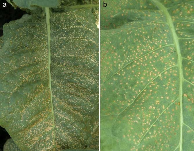 Observam-se muitas bandas de tecido verde escuro ao longo das veias (bandas das veias) (figura 2), pequenas manchas brancas a castanhas também podem ser observadas na superfície superior das folhas mais jovens, são bastante semelhantes às causadas por "manchas climáticas". (Figura 3).