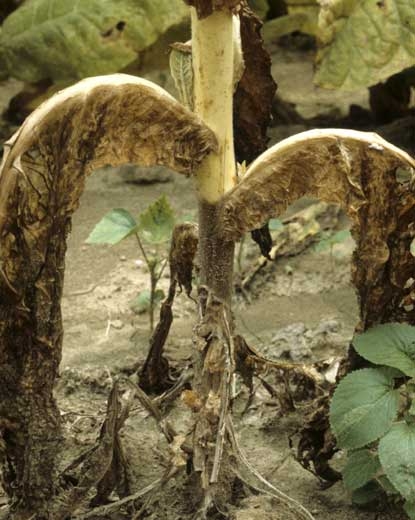Infecções foliares ocorrem durante períodos chuvosos. Eles são caracterizados por grandes manchas marrons ou pretas nas folhas inferiores.