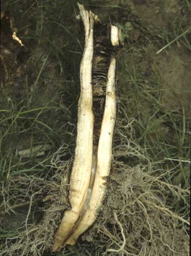 Um corte longitudinal do caule revela que a medula é marrom a preta, encolhendo em alguns lugares, parecendo formar discos empilhados ("pilha de pratos").