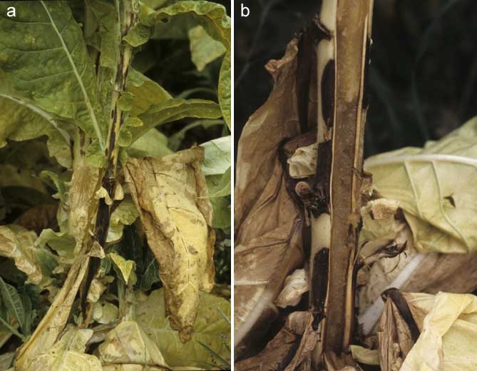 Pode também ocorrer durante a cura, causando danos semelhantes aos danos causados pelo Pectobacterium chrysanthemi. As folhas infectadas desenvolvem uma aparência úmida e preta à medida que a podridão se espalha pelo pecíolo e progride gradualmente até as veias e os tecidos inter-venosos (figura 4).