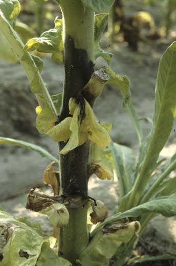 No caule, as lesões são marrom ou preta escuras e profundas (Figura 5). A infecçao começa na haste e outros sintomas podem ser observados (Para mais informações veja Lesões externas e internas da haste).