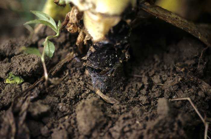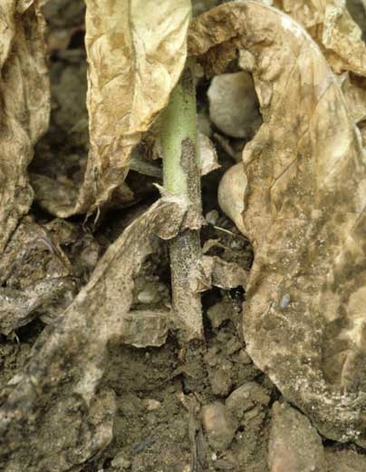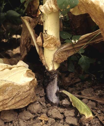 O fungo Thanatephorus cucumeris (Rhizoctonia solani) está presente em muitos solos e causa danos no tabaco que aumentam progressivamente. O fungo induz lesões de coloração marrom a preta no colo que ocorrem com maior frequência após o plantio, que circunda o caule no nível do solo (figuras 1 a 4). Embora possa ocorrer no viveiro (ver doenças no viveiro e após o plantio), parece que a infecção ocorre logo após o plantio.