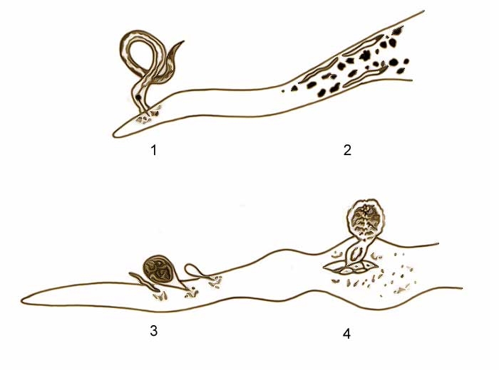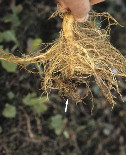 Nematoides endoparasiticos migratórios "nematoides de raiz" (figura 1) penetram no córtex da raiz e gradualmente destroem muitas células, induzindo abundantes lesões avermelhadas a pretas nas raízes (figuras 2-4). Estes sintomas são semelhantes aos induzidos por T. basicola, exceto pela presença de areas com aparencia decortiças nas raízes. Adultos, larvas e ovos são frequentemente visíveis em células do córtex (figura 5), e podem confirmar o diagnóstico