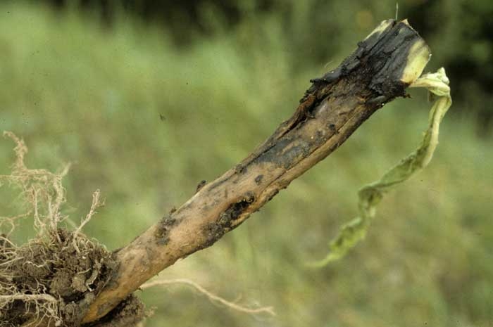 Durante períodos de alta umidade, bactérias do gênero Pectobacterium (antiga Erwinia) podem ser observadas em folhas de tabaco causando uma podridão negra a partir das nervuras (figura 1). Então, através dos pedunculos, elas se movem e cobrem a haste, que passa a demonstrar rachaduras limitadas. Mais tarde, se a umidade persistir, a podridão se estende ao córtex (figura 2) e a medula (figura 3), que ficam macios, de coloracao marron a preto.