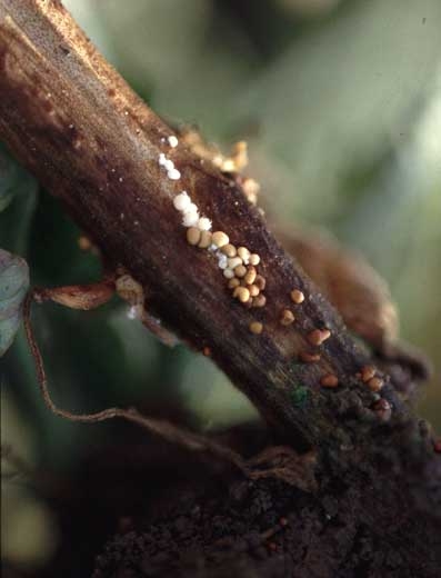 As lesões de aspecto encharcado surgem nas hastes ao nível do solo (figura 1). São frequentemente côncavas, castanho-claros, de textura seca e por vezes rodeadas por anéis concêntricos discretos. Micélio branco abundante pode cobrir as lesões e, por vezes, o solo perto do caule (figura 2 e 3). Inumeros esclerodios de superficie lisa, redondos e pequenos (1-3 mm) do fungo podem ser observados. No início, os escleródios são brancos, mas gradualmente tornam-se marrons à medida que amadurecem (figura 1 e 4).