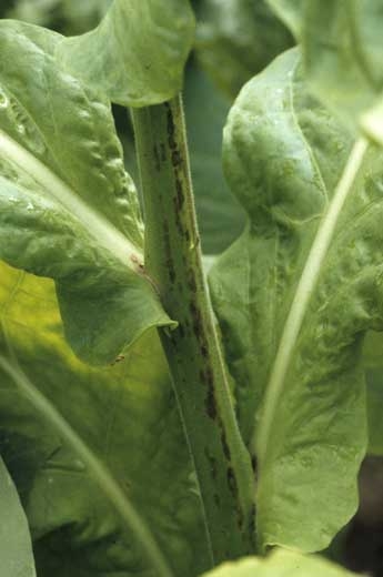 Vários vírus induzem lesões às vezes no córtex da haste. As lesões são muitas vezes marrons, de comprimento variável, em linha em um lado da haste ("raias"). Entre esses vírus estão: PVY (vírus da batata Y), CMV (vírus do mosaico de pepino) e TSWV (vírus do vira-cabeca do tomateiro). Na França, os sintomas acima mencionados são frequentemente associados à presença de PVY (figura 2).