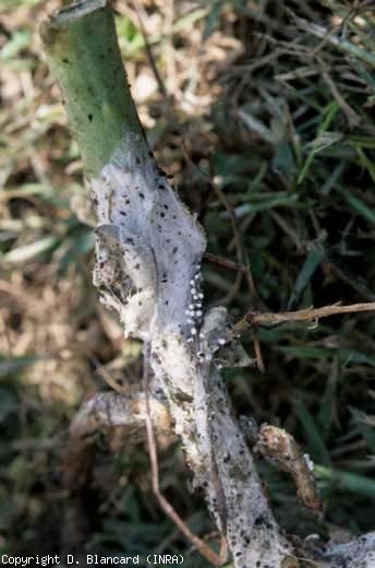 Soulignons que le collet, partie de la tige située au niveau du sol, est particulièrement vulnérable, notamment au stress hydrique et à quelques champignons « spécialisés » comme Sclerotium rolfsii. Ainsi des altérations plus ou moins étendues, ceinturant parfois totalement la tige, caractérisent-elles un problème au collet. Dans bien des cas, les flux de sèves seront perturbés, entraînant des jaunissements et/ou des flétrissements plus ou moins réversibles.