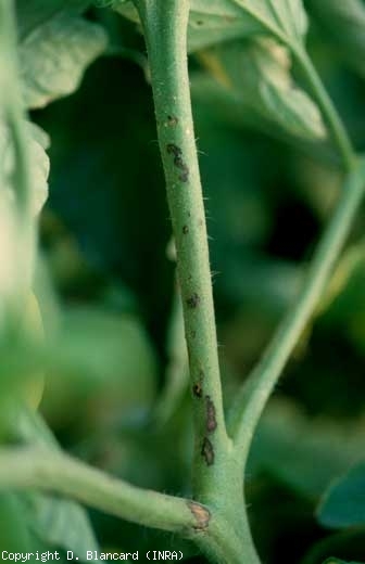 • Pseudomonas syringae pv. tomato, responsable de la moucheture (bacterial speck), est à l'origine de petites taches de 1 à 2 millimètres de diamètre, irrégulièrement arrondies, de couleur brune. Ces taches sont cernées progressivement par un halo jaune assez marqué (figure 1). Si les conditions sont particulièrement humides, elles s'étendent, confluent et altèrent des secteurs entiers du limbe. Des lésions brunes, allongées, peuvent se développer sur les pétioles, les tiges (figure 2) et les inflorescences à l'origine, dans le dernier cas, de chutes de fleurs.