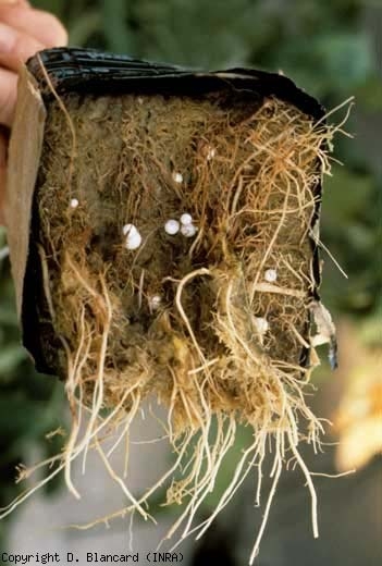 Ce champignon dévastateur est avant tout inféodé au système racinaire de la tomate (figure 1) sur lequel il provoque, dans un premier temps, des lésions localisées sur le cortex de couleur marron à brune. Par la suite, celles-ci s'étendent tandis que d'autres apparaissent. À terme, les racines brunissent presque entièrement, pourrissent plus ou moins et se décomposent. En plus du cortex, qui est particulièrement affecté, le xylème peut brunir : une coupe longitudinale du pivot et de quelques grosses racines permet de le constater.