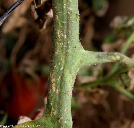 - des petites lésions de quelques millimètres de diamètre, d'abord blanchâtres et devenant rapidement chancreuses, apparaissent sur les organes aériens de la tomate. Ces petits chancres superficiels, qui se nécrosent lentement, sont plutôt rares sur les Folioles, plus fréquents sur la tige (figure 7), les pétioles et les fruits (figure 8). Sur ces derniers, ils ont souvent une apparence particulière : des petites taches circulaires blanches et plates en périphérie et dont le centre est plus en relief, parfois éclaté, de couleur beige à ocre. Ces caractéristiques leur confèrent l'apparence d'un oeil d'oiseau (bird's eye spot, figure 8). Par ailleurs, l'émission de racines adventives peut avoir lieu sur la tige.