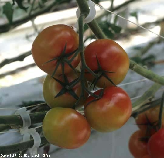 A melada também é produzida em grandes quantidades; é posteriormente colonizado por fuligem que cobre a superfície dos órgãos aéreos do tomate, causando amarelecimento e mudanças nas folhas. Além de reduzir a fotossíntese e a respiração das folhas, o fuliginoso suja os frutos (figura 2) e altera a sua coloração, tornando-os impróprios para comercialização. B. tabaci também pode ser responsável por defeitos de coloração (maturidade irregular), ou manchas nos frutos (figura 3).